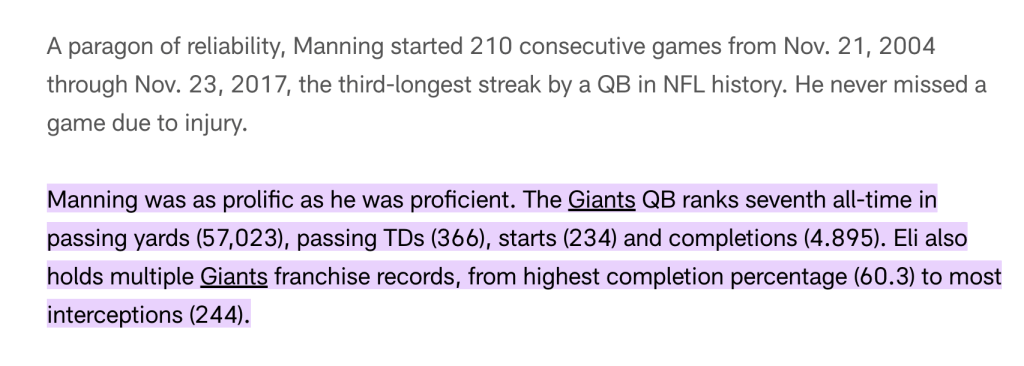 So what exactly did Eli do to deserve to make it into The Hall Of Fame on his first go around? Let me show you: